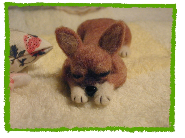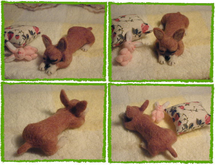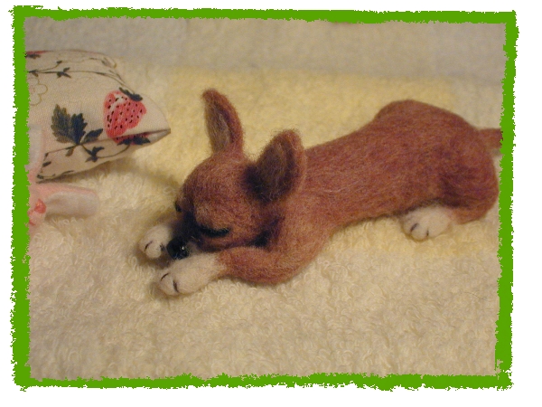 | ・モデルワンコなし、チワワのようなMIX犬?です。 同じくMさまオーダー。 目を閉じた初のワンコ・・・難しかったです (^^; 瞳がないと一見楽そうなんですが、やはり顔のバランスが分かり難いのですね〜〜。 しかも「何犬だろうこれは…?」というような謎犬だったので余計に(笑) でも色々選ばれた中でもMさま一番のお気に入りワンコで、出来上がってみれば何とものほほ〜〜んとした癒し犬。 今回のMさまのオーダーは全て甥御さんへのプレゼントということだったので、(素敵な叔母様ですね〜♪) 持ったり触ったりしても毛の抜けが少ないように、毛羽立ちを押さえてやや堅めにしっかりと作ってあります。 甥御さん、喜んで小躍りしてくれるといいな〜〜(*^-^*)♪ |