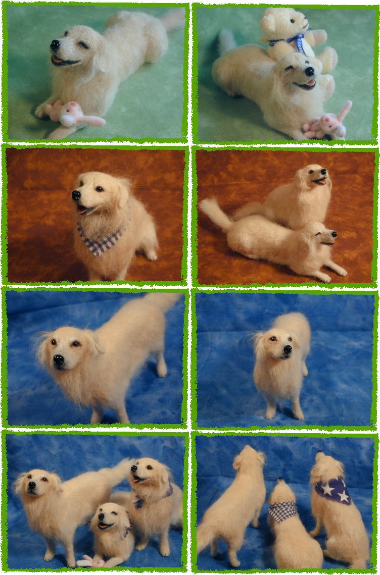 | ・Tさまからオーダーのゴールデン・レトリーバー・フクちゃん 被毛がフワフワサラサラと輝く、その名の通りスーパー・ゴールデンなフクちゃんです(^^) 「是非、原毛を使って…」との初めてのご依頼でした。 全体の80%にワンコ原毛を使用した始めてのミニチュア・ワンコです。 お写真も選りすぐりの可愛い表情てんこ盛りの写真集まで作ってくださり、 耳の付き方や尻尾の毛…色々ととても参考になりました!(今後の制作にも大活躍しそうですvv) 自然の中でくつろぐフクちゃん、ストレスのなさそうなとてもよい表情…羨ましい〜 。 ぬいぐるみとドライブが大好きで、ご家族のアイドルとして大事にされているようです♪ でもこーんな可愛い表情はご家族だけしか見られないんて惜しいっっ…(ご家族以外には素晴らしく番犬) 殆どを原毛で作ったため、色合いはかなり近い気がします。 フクちゃんはバンダナ犬だったので、ミニチュアにも全員バンダナをお付けしました(1匹は写真撮るの忘れた(^^;) どうかこれからもフクちゃんがストレスフリーで幸せに暮らせますように! |