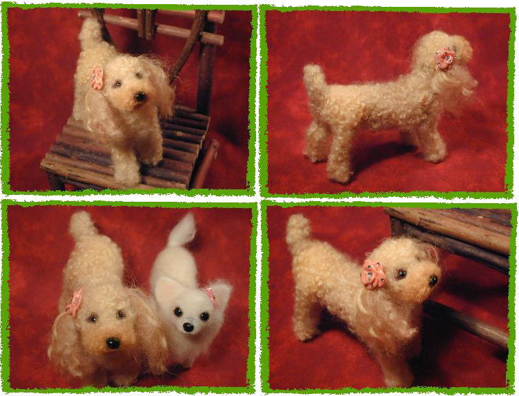 | ・mayukottinさまのオーダー1匹目、トイプードルのモゲるくん。 以前、ありもんちゃん達総勢6匹のオーダーを頂いたmayukottinさんからの追加オーダーで、 あもりんちゃんたちのお仲間なんですねー^^ なのでプーチくんと一緒に写ったりしてます♪ モゲるくんはアプリコットで、前回お作りしたレッドのプーチ君と比べると全体的に大きめ、 毛の巻きも強い感じだったので、プーチ君のようなほわほわではなくクリクリ巻き毛で再現してみました。 女の子みたいにピンクが似合うモゲるくんですが、実はとっても怖がりさんで人間が苦手…。 飼い主さんのお宅へ貰われるまでに何かあったのかも…とのことでした。 そんなモゲるくんも今では ご家族にだけは心を開き、甘えたりちびグルメっぷりを発揮したりと毎日を楽しんでる様子です (^^) 同時オーダーのペスちゃんと一緒に暮らしています^^ |