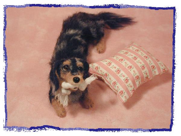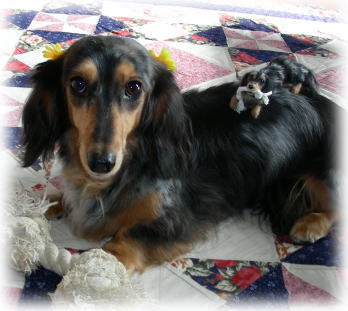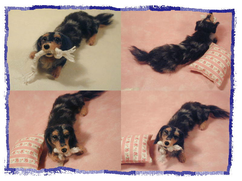 | ・きらままさまのオーダー3匹目、同じくダックス・ブラックタン・シルバーダップルのココちゃん。 ココちゃんはリヴちゃんの娘できらちゃんの孫にあたります。 3世代女系ファミリー!楽しそう〜〜♪ 姫気質、優等生、とくればラストは破壊魔ココちゃんの出番です(笑) 3匹の中で一番大きなサイズですがダップルはリヴちゃんよりは少な目、タンもちっょと薄めです。 性格は天真爛漫、豪快に遊び豪快に壊す!それがココちゃん (^^; でもきらちゃんの遊んでるおもちゃは決して取らないという分別だってしっかり持ってます。偉いねココちゃん^^ おもちゃ秒殺(笑)のココちゃんお気に入りは大型犬用のコットンロープ♪ 大事そうにカミカミしている写真が届いたので、それをモデルに作らせて頂きました! |