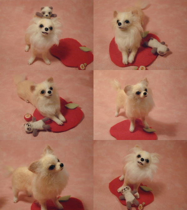 | ・りんごさんオーダー、ベージュ&ホワイト・ロングチワワのりんごちゃんです。 もうすぐ3歳になるりんごちゃん、クリクリの瞳と額にうっすら入ったホワイトがチャームポイント♪ おもちゃとご飯が大好きで、チワワの例に漏れずなかなか気が強いらしいです(笑) お家の番犬役も果たす小っちゃなりんごちゃんですが、こう見えて芸達者!基本のお手・お座り・伏せ以外にも バーンで死んだふり(笑)、おもちゃの持って来い、離せ、など賢い賢い!!! ちょっとお転婆な女の子なイメージで「りんごちゃん」って名前もピッタリだと思います。 (妹・イチゴちゃん出来ると良いですね(^^)) 今回はそんなりんごちゃんの3ポーズ。 ゴールデンのフクちゃんの時と同じく、 立ち・お座り・伏せで表情も少しずつ違います。 オマケは飼い主・りんごさんからリクエストのあったミニチュア・クマさん、りんごのおもちゃ、 あと、いかにもりんごちゃん!っというものが欲しかったのでリンゴマットを作ってみました^^ コントラストも良いし、下に敷くとりんごちゃんが映えて仲々面白いものが出来上がりました♪ もっともっと生りんごちゃんを見たい方は、こちらの ringo style で可愛いりんごちゃんに会えますv ウフフ(* ̄m ̄) 生リンゴちゃんのちょびベロもすんごく可愛いですよ〜〜! |
