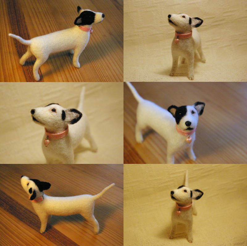 | ・Noriさまオーダー2匹目のブルテリアMIX・プリンちゃん。 こちらも虹の橋を渡っていったブルテリアMIXの女の子。 こう見えてもとっても臆病な女の子でご家族以外の人間には仲々懐かなかったそう。 ブルテリアの血は入っていても何となく優しい顔立ちはそんな性格も現れているのかもしれませんね。 人は苦手でもワンコは大好きで、遊び好きな一面もあったとか (*^-^*) お写真がこの2枚だけだったので上手く雰囲気掴めたか心配でしたが、Noriさんにはご満足頂けて ホッとしたプリンちゃん制作でした。 ブルテリアという男の子ちっくな外見で間違われそうなので(笑)オマケはピンクのチャーム付きカラー♪ 初ブルテリア(MIXだけど)は、色々と学ぶところが多かった楽しい制作となりましたv プリンちゃん、今頃はNoriさんに大好きお散歩せがんでいるのかな^^ |